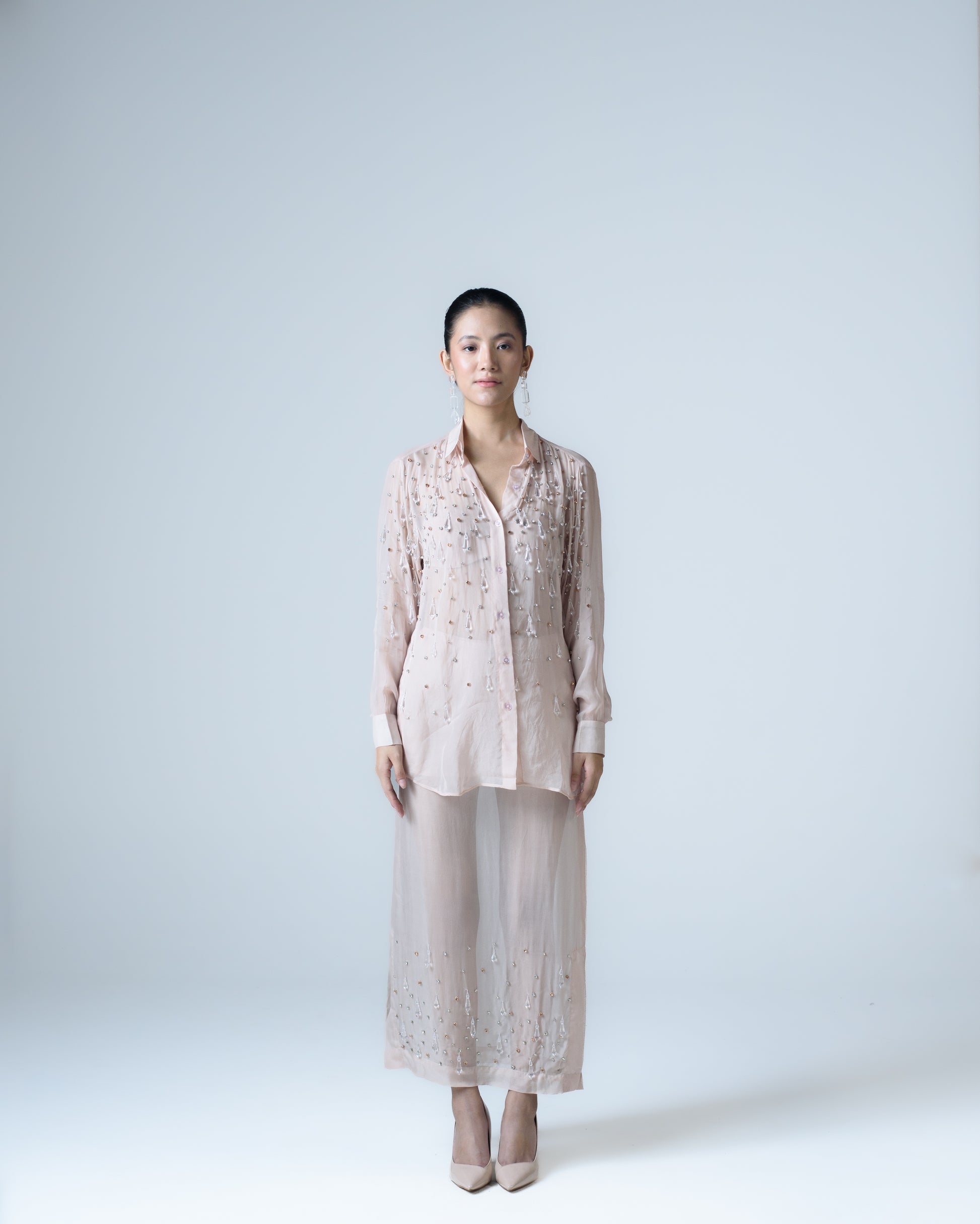 Hand-beaded embellishments along the hemline create a delicate play of crystal drops and rhinestones, making it a refined stand out piece.