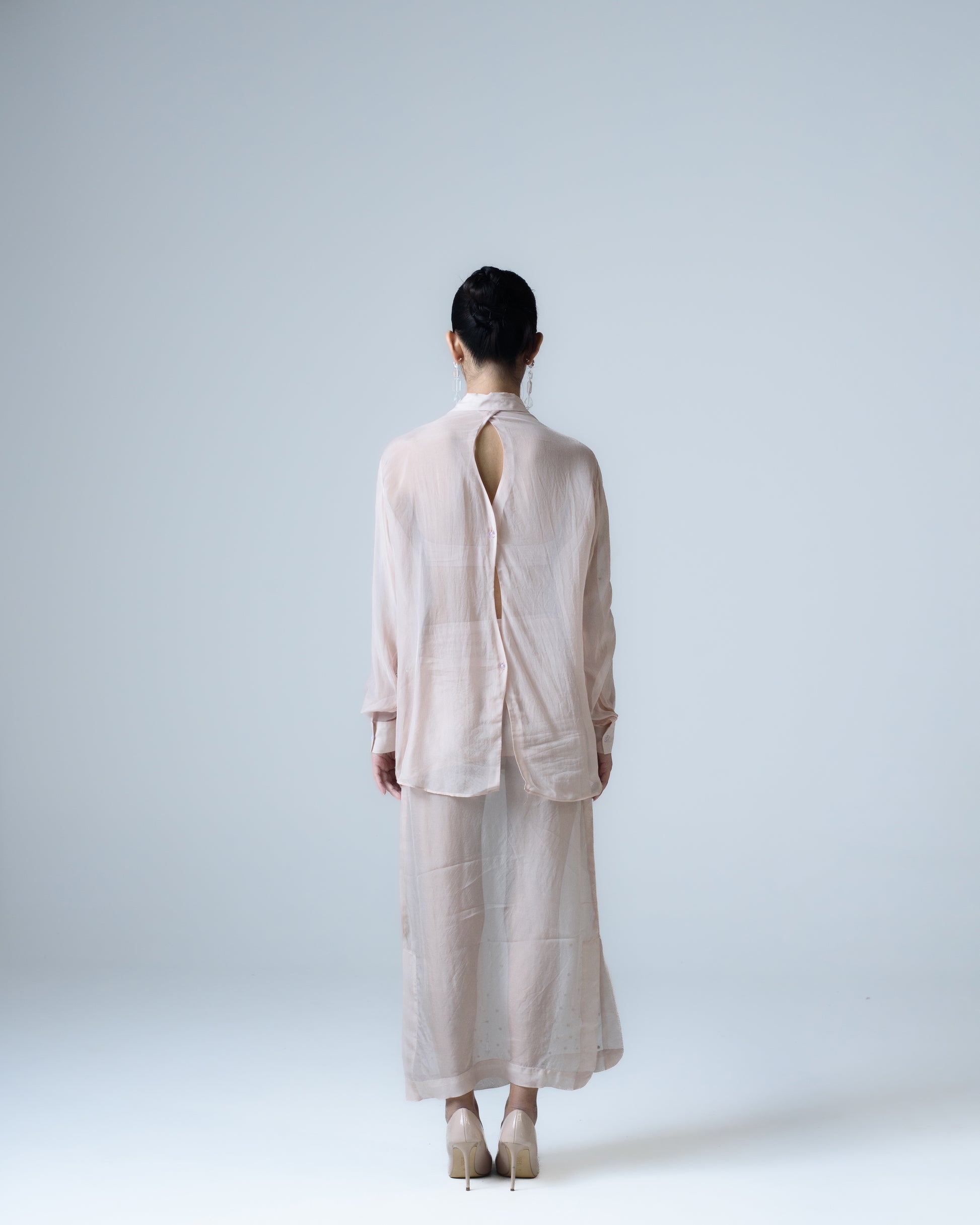 A graceful organza midi skirt designed in a fluid silhouette that falls elegantly below the knee. The skirt features a high waistband with a soft flare for effortless movement. Half lined.