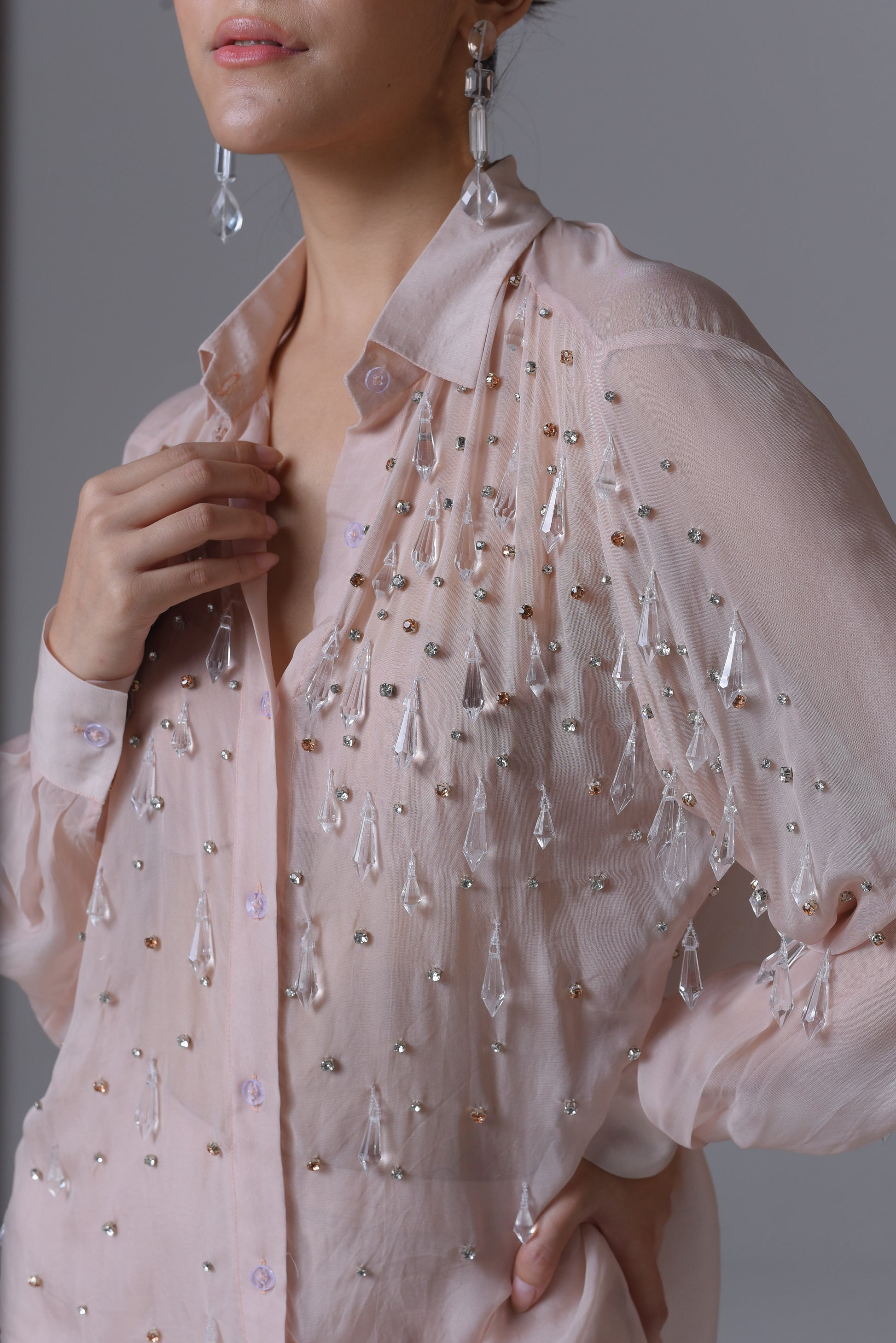 The shirt is delicately hand-embellished with crystal drops and rhinestones, adding subtle glam that makes it stand out.