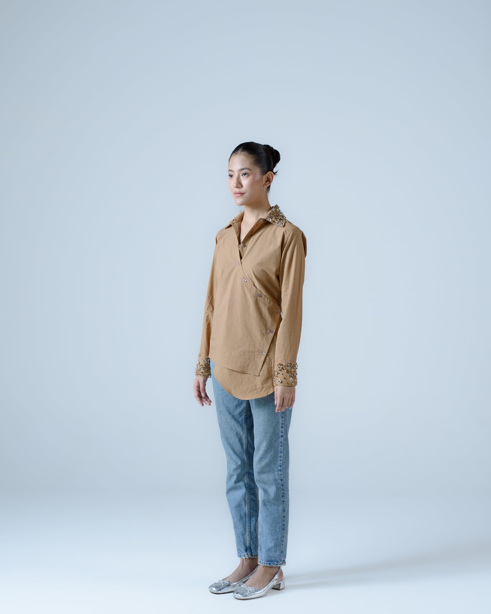 The shirt is finished with hand-embellished beadwork on the collar and cuffs, adding refined sparkle to its modern minimalism.