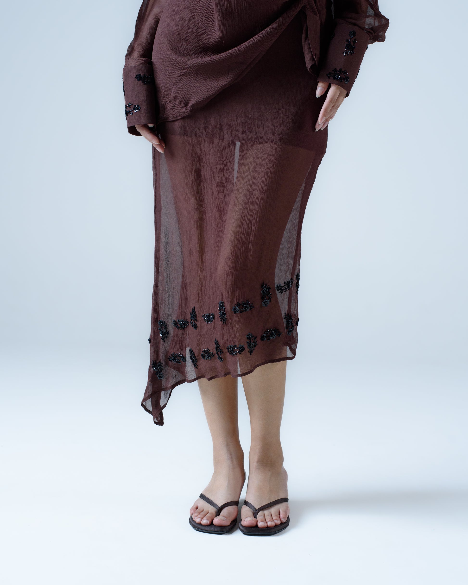 The skirt is finished with hand-embellished sequin and beadwork along the hem, adding texture and sparkle to its elegant silhouette.