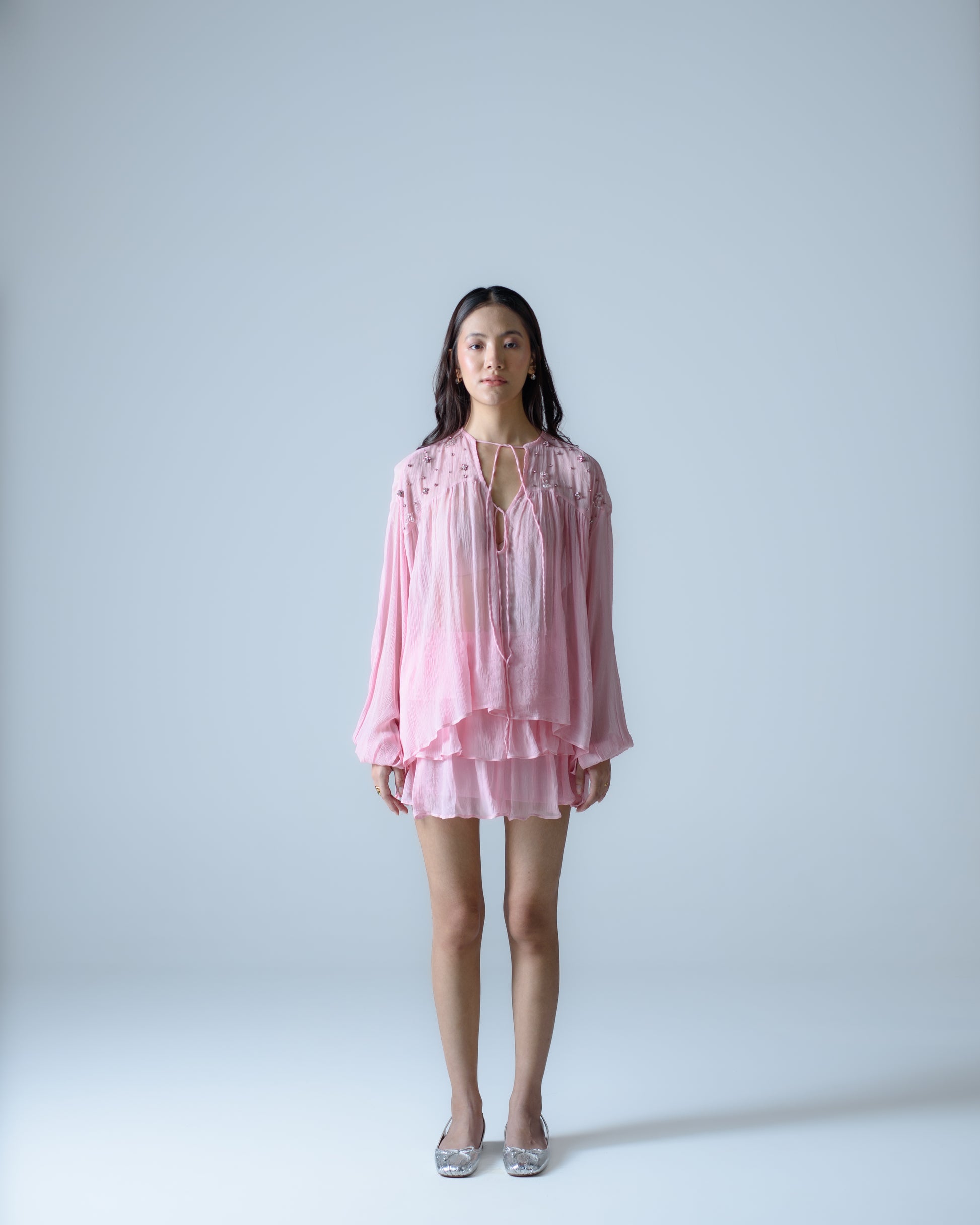 A flowy silk chiffon blouse designed with long puff sleeves and a relaxed silhouette, detailed with a tie-up neckline for a feminine finish. Unlined.