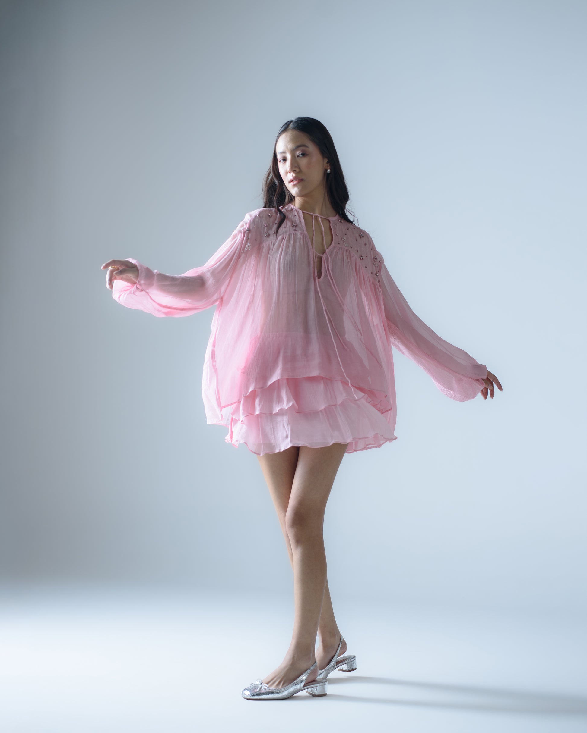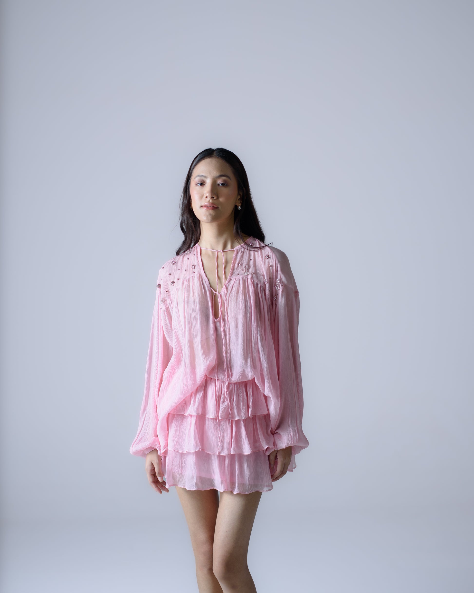 The blouse is adorned with hand-embellished beadwork across the shoulders, adding subtle shimmer to its airy, layered design.