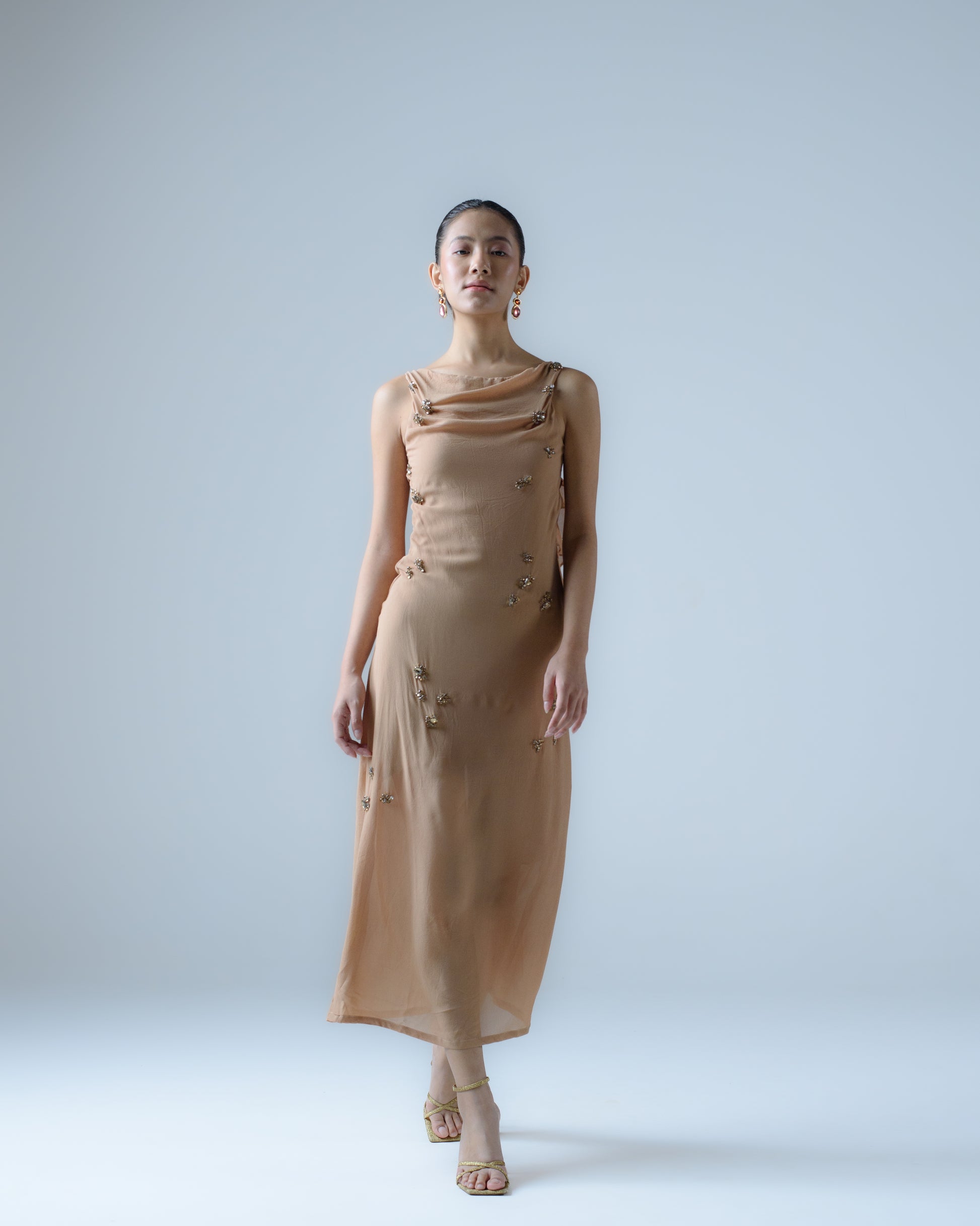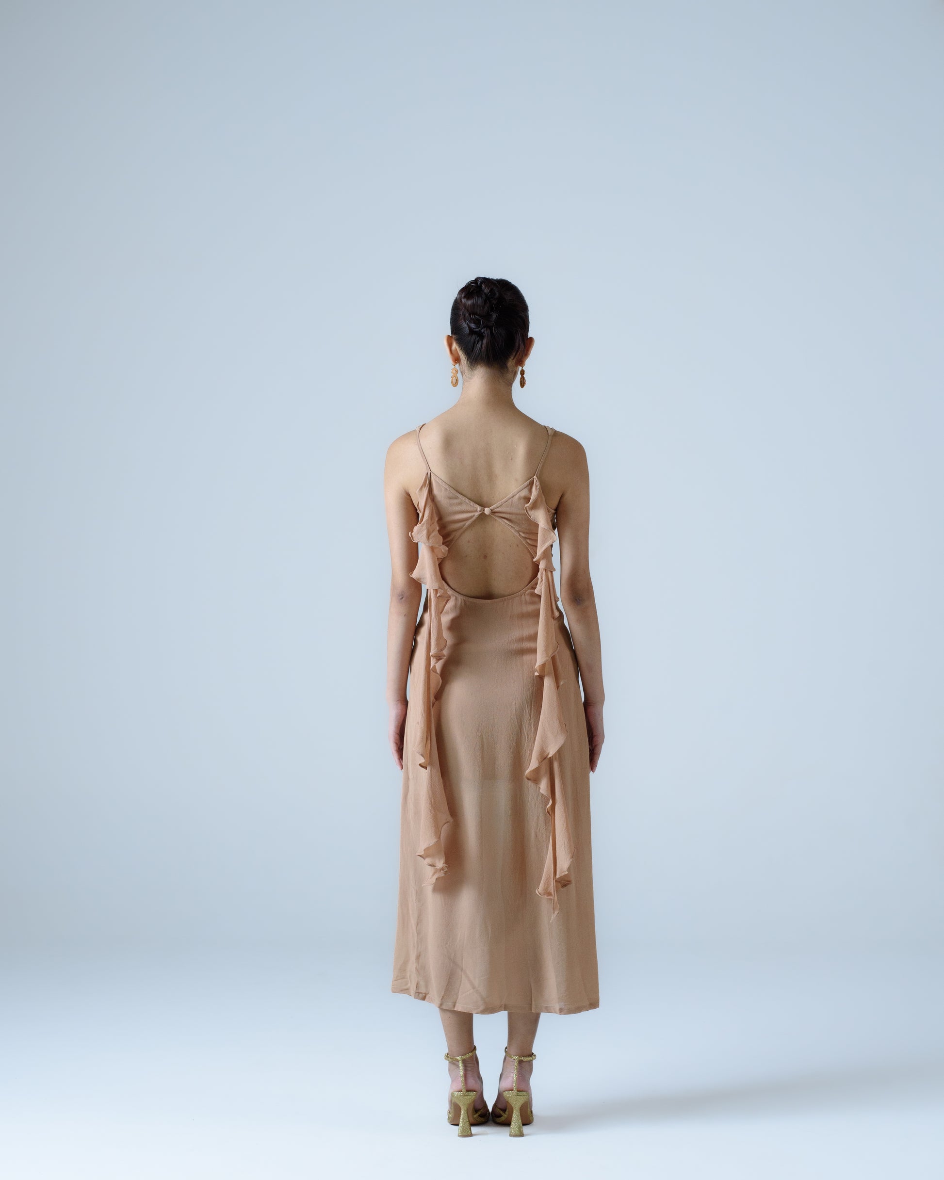 A midi-length dress crafted in silk chiffon, designed with a soft cowl neckline and straps for an elegant, feminine silhouette. The back highlights a keyhole and ruffle detailing. Half-lined.