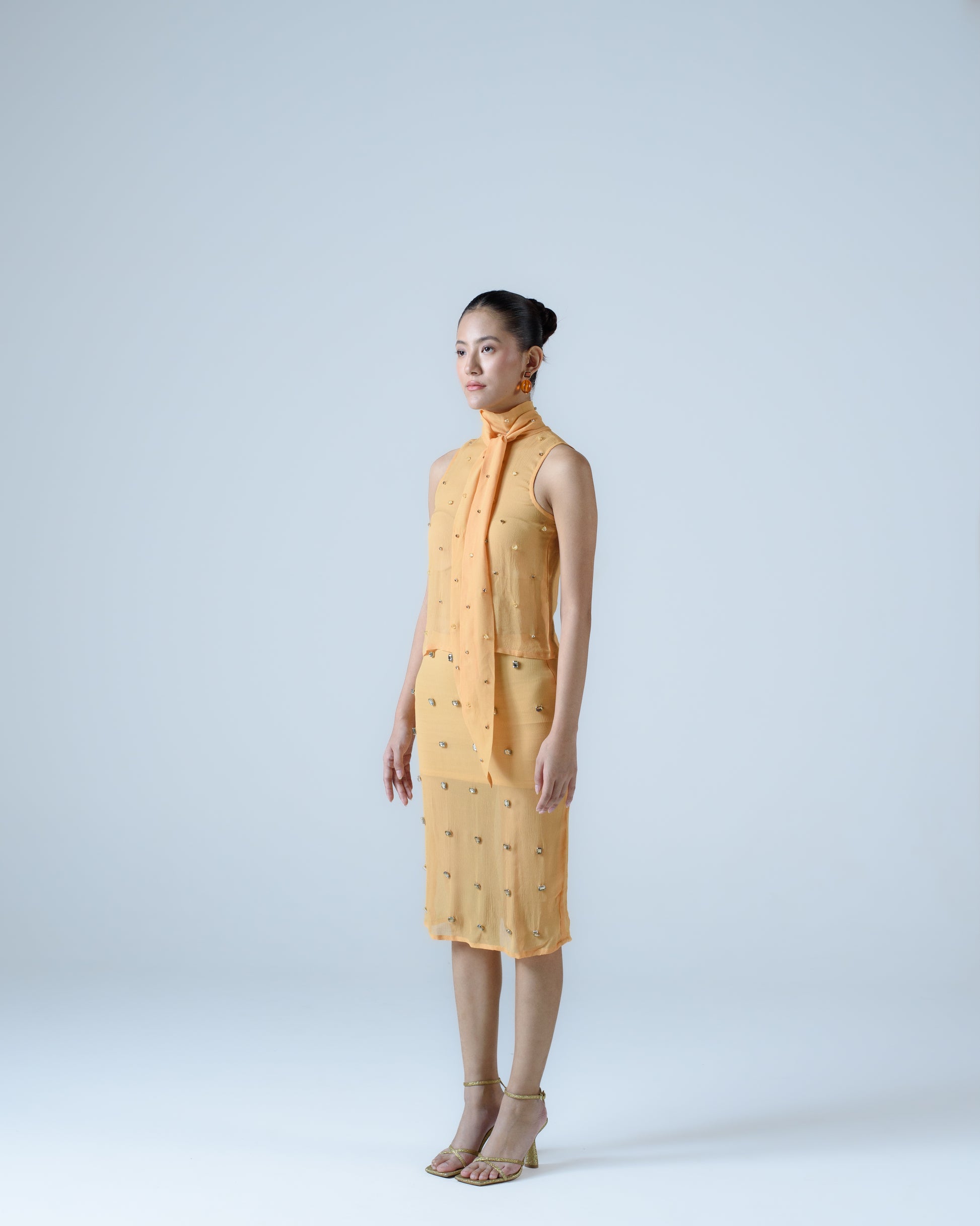A straight midi skirt crafted in lightweight silk chiffon, designed to sit high on the waist for a flattering fit.