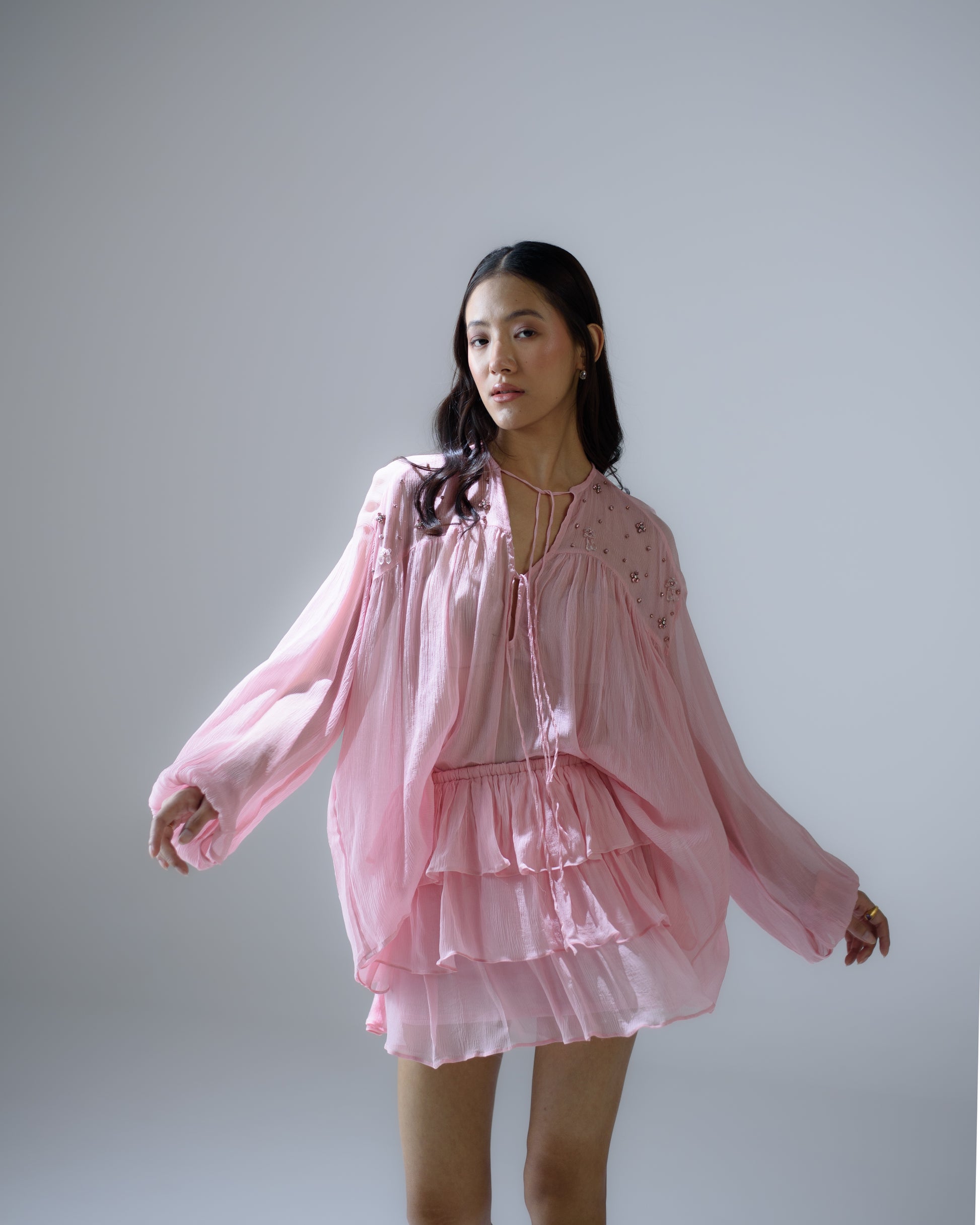A playful mini skirt crafted in silk chiffon, designed with multiple tiered layers that create soft volume and movement. Elasticated waist. Lined.