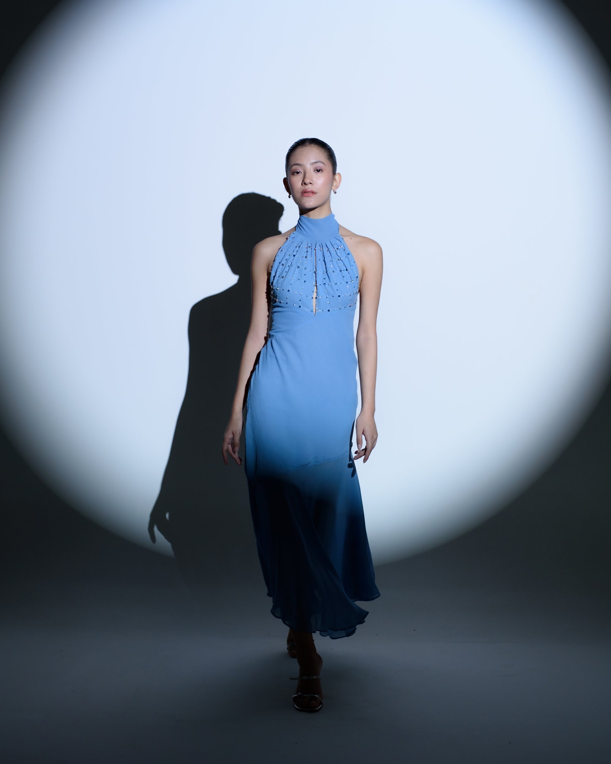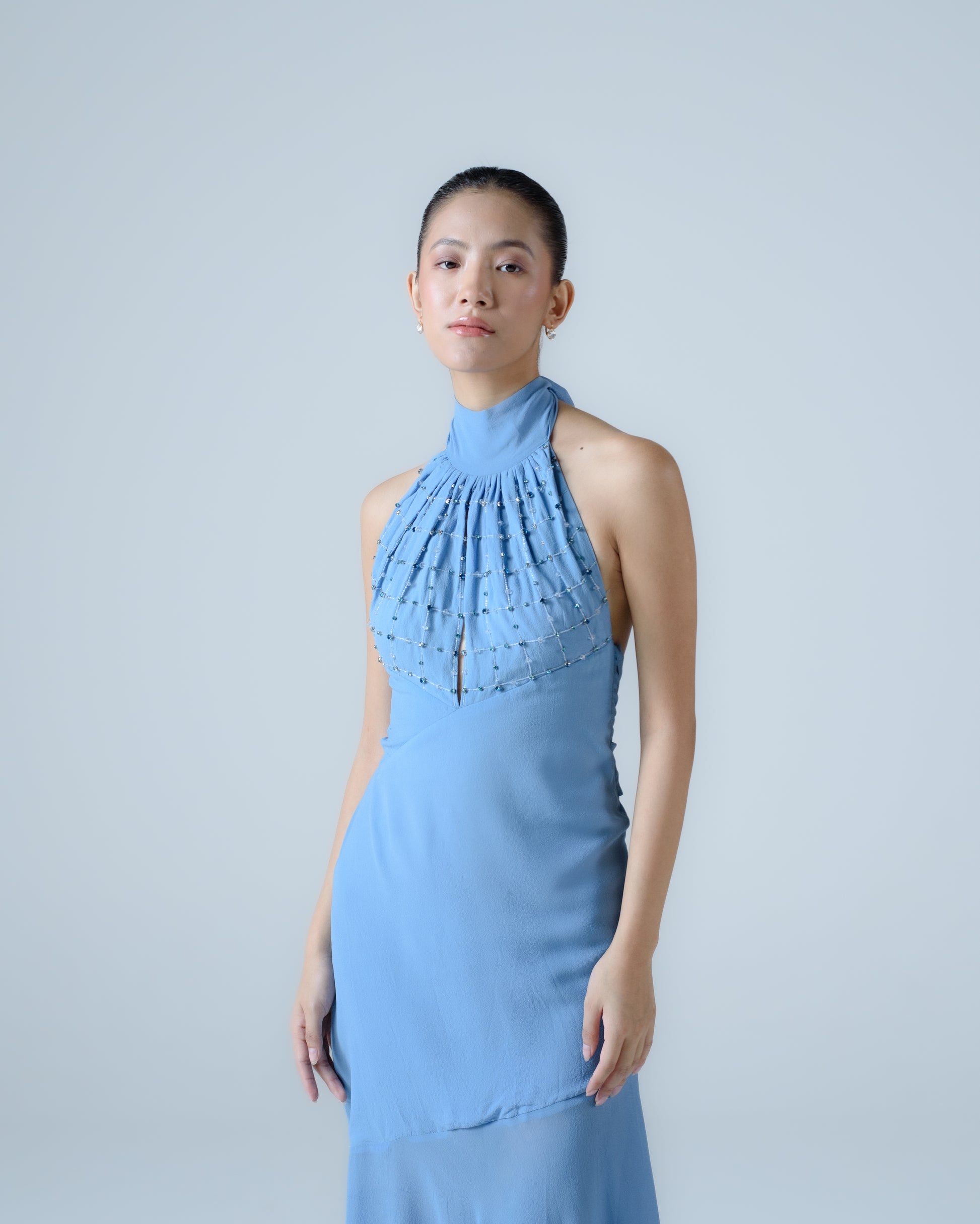 A halter neck midi dress crafted in fluid silk georgette, designed with a gathered neckline that flows into a sleek, elongating silhouette. Half-lined.