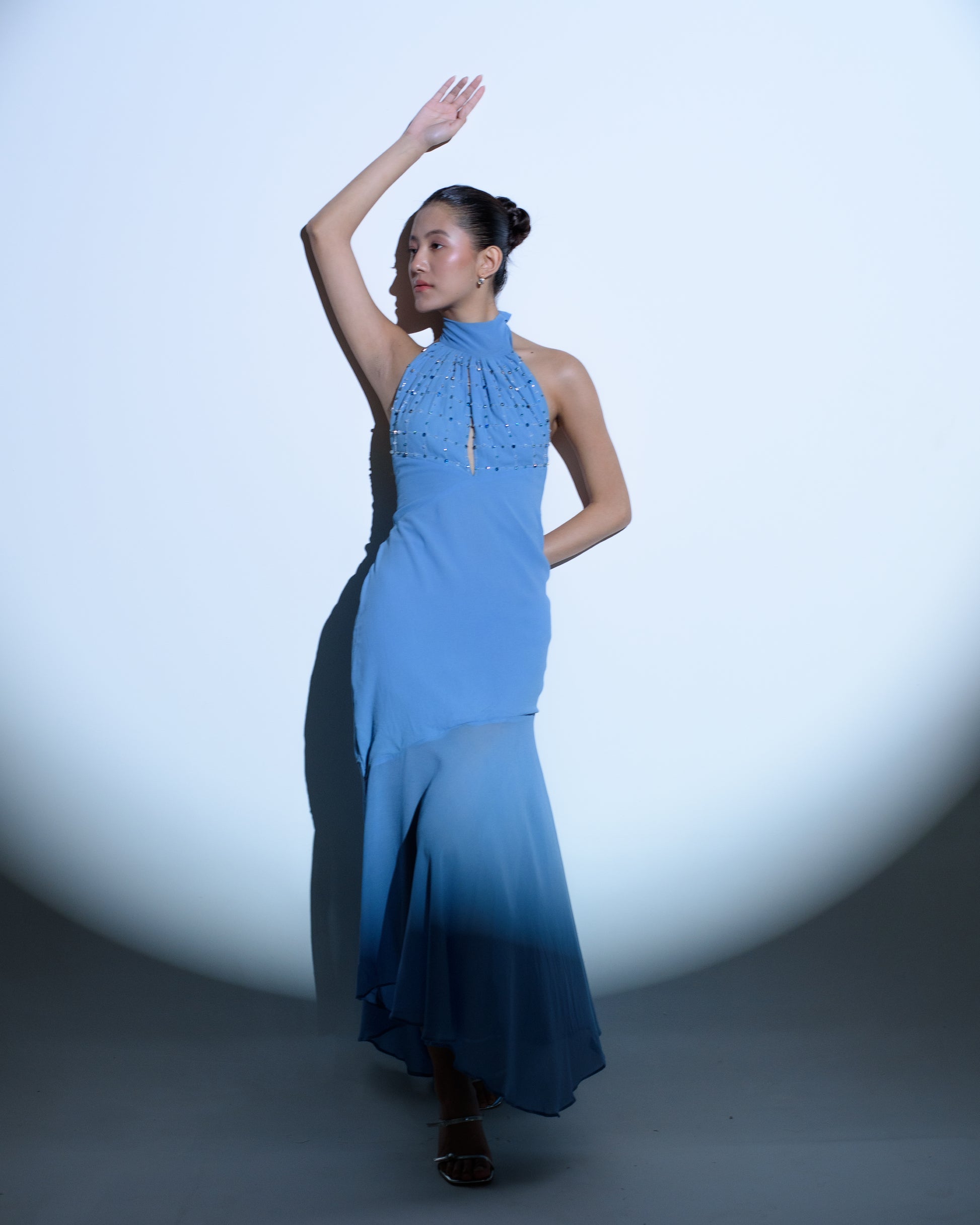 The bodice features delicate beadwork embellishments, adding subtle shimmer, while the asymmetric hemline enhances movement and elegance.